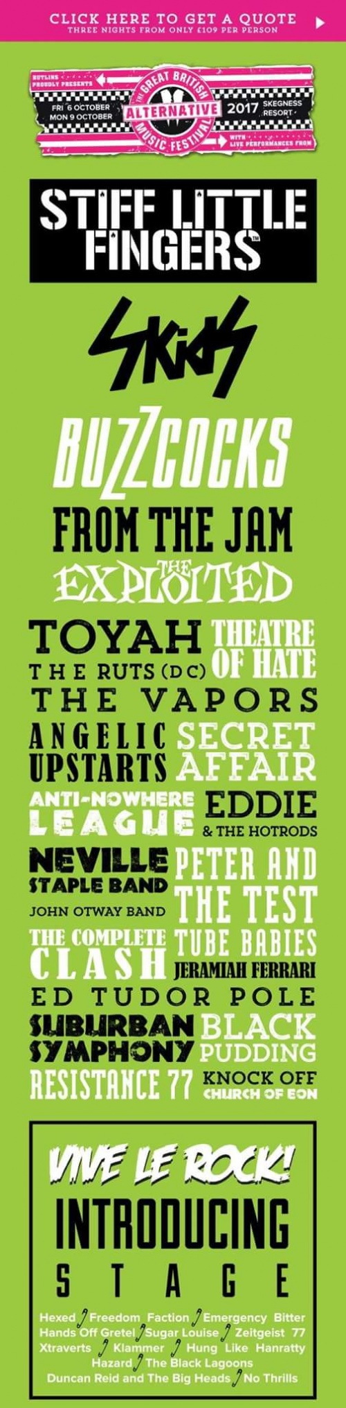 The Great British Alternative Music Festival celebrates the best in Punk, Ska and New Wave. Check out legends such as Ruts DC, The Skids, Resistance 77, The Vapors, Lene Lovich and many more!